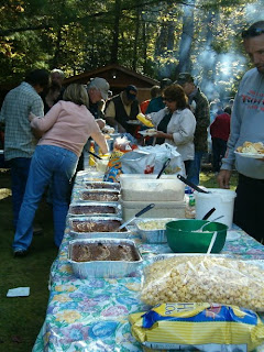 The morning started out with temps in the 50's and eventually warmed to the 60's. It was a beautiful day, bright sunshine and that deep blue Carolina sky. A super day for hanging out clothes on the clothesline, hiking and later a wienie roast. Nancy and I hiked to the top of the mountain and had a short visit with Norm. We made arrangements to pick up our weekly dozen of free range brown eggs next Tuesday. We came back and had a lite lunch as we knew there would be a ton of good home cooked food; and we were right.